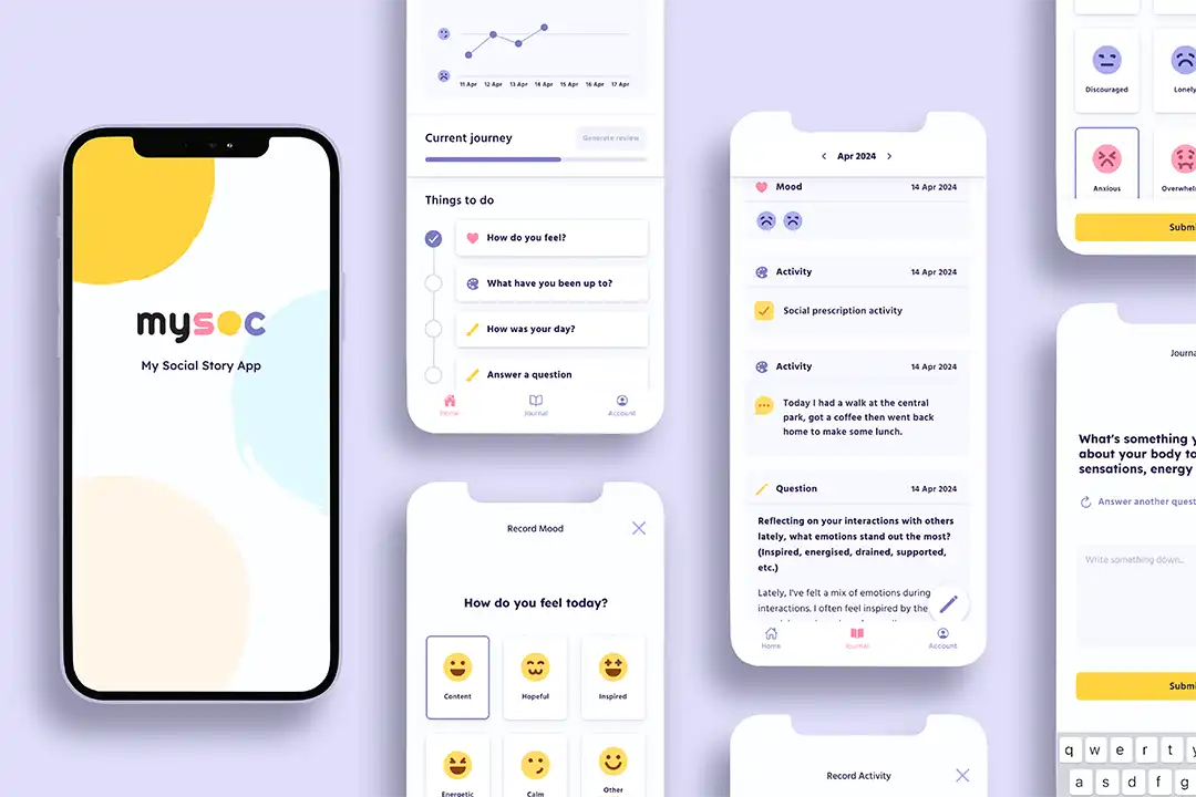 The first step was to create a placeholder brand, MySoc which would resonate with participants and their journey. We carefully considered colours and typography to avoid any clinical associations, ensuring the branding felt welcoming and accessible.